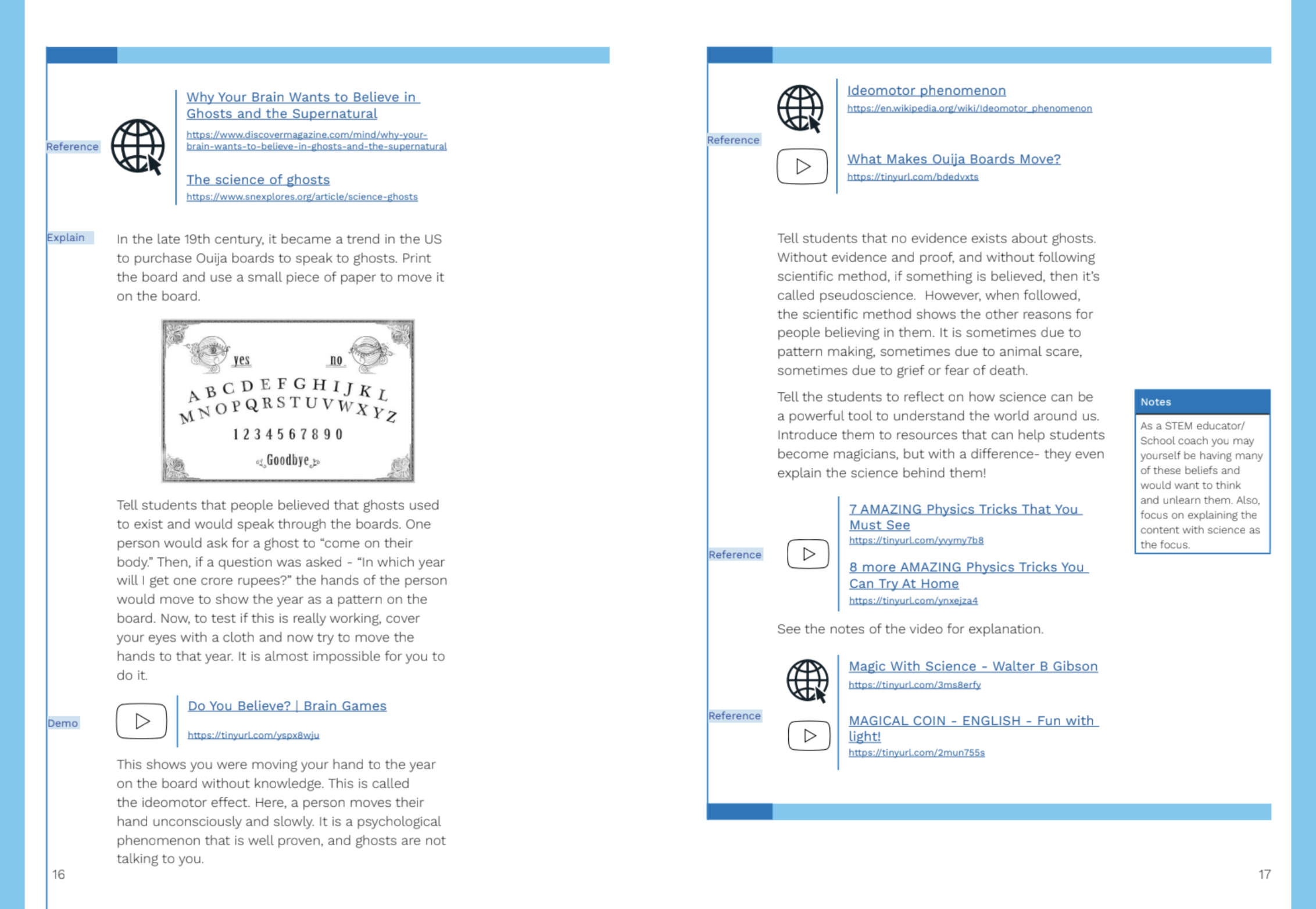 Questioning superstitions - students learn about the Ouija board (a board used to speak to ghosts) which became popular in the US in the late 19th century. They then try speaking to ghosts with funny question prompts, first without a blindfold on, and then with a blindfold on. The aim is for them to discover that while coherent answers are provided by the so-called ghost when the students don’t wear blindfolds, the answers are all random when they have blindfolds on. The session concludes with them learning about the ideomotor effect and finally reflecting on what superstitions they can question in their unique cultural contexts.
